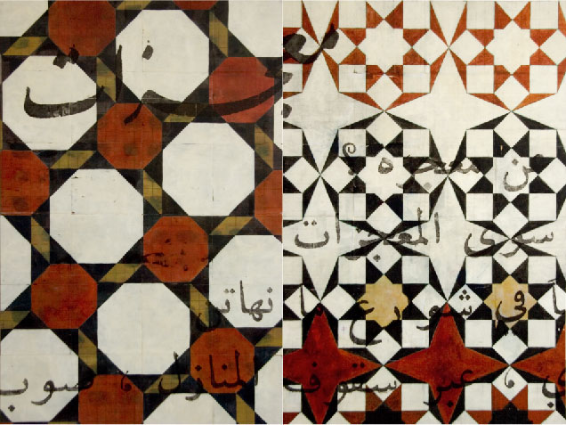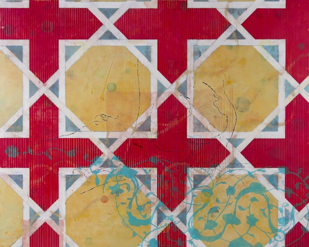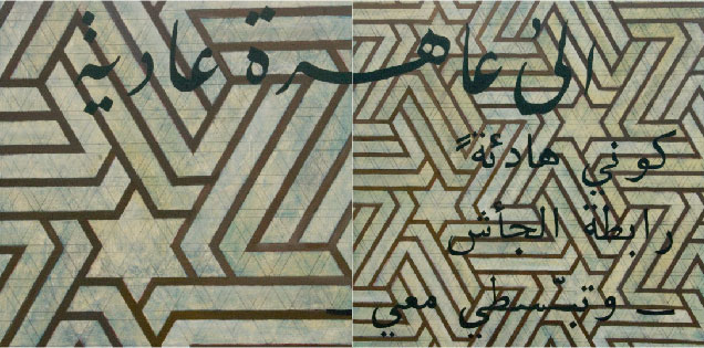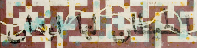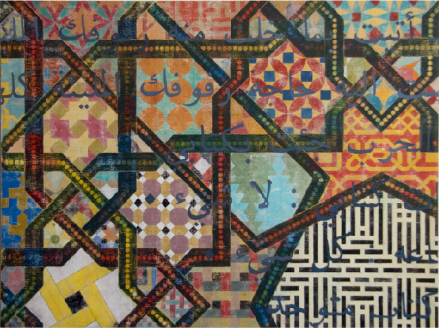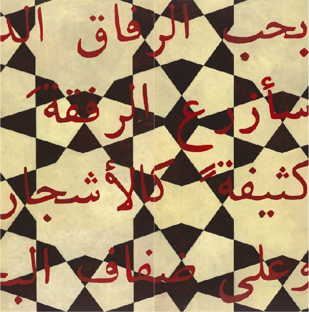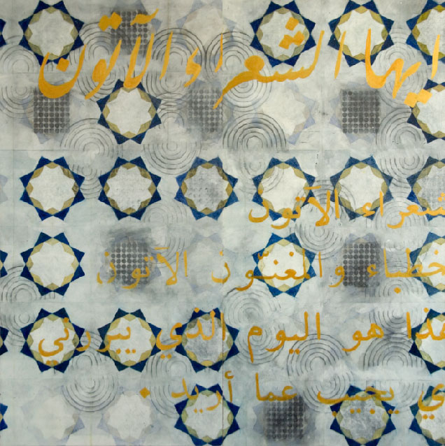 The inspiration for the earliest works in this series stemmed from the 2003 invasion of Iraq by the US. In this body of work I combine my love of geometric design; in this case, patterns from Islamic art and architecture along with poems from Walt Whitman’s Leaves of Grass translated into Iraqi. My intention is, in an understated way, to question our lack of understanding and respect for Arab and Islamic cultures while at the same time, protesting the war. Whitman—for me the quintessential American poet—was a celebrated unifier and embracer of cultures and customs.